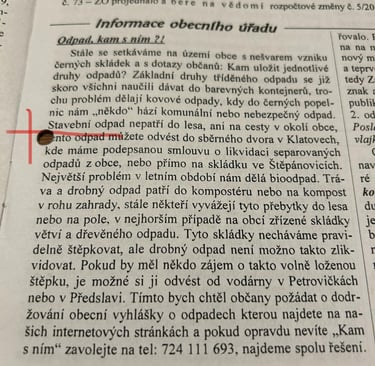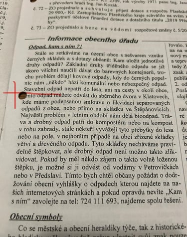 V obecním zpravodaji č. 50 ročník 2019 (viz foto za článkem) občany rázně poučili, že černé skládky v lese jsou nešvar, a že každý občan má odpad odvézt do sběrného dvora v Klatovech. Chvályhodné doporučení. Jenomže platí jen pro poddané – pardon, běžné občany Předslavi, ne už tak pro starostu a zastupitele.