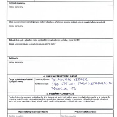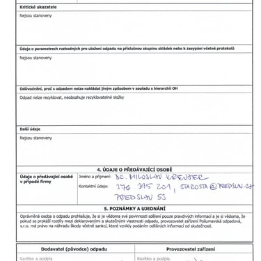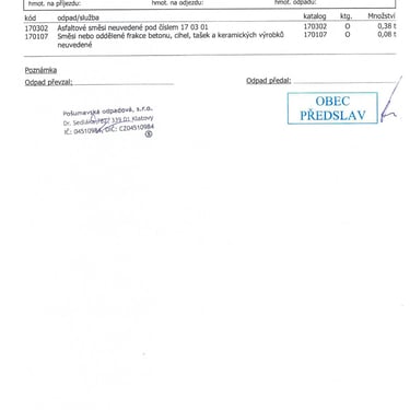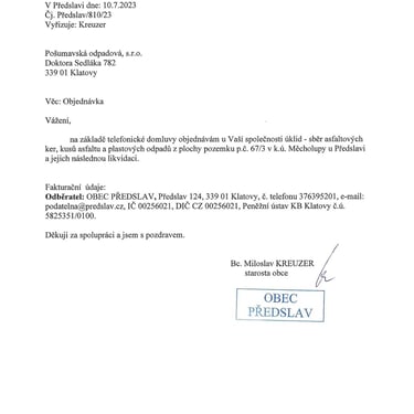 - zfalšovaná evidence odpadu doložená předložená starostou obce Předslav a jeho průvodní dopis