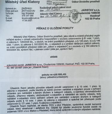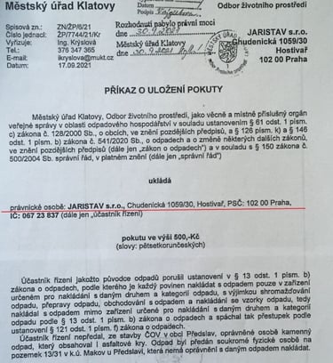 - rozhodnutí o uložení pokuty společnosti JARISTAV s.r.o. za nelegální nakládání s odpadem