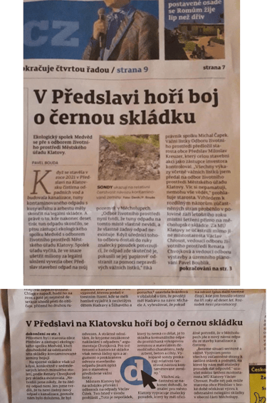 Nezbývá nám, než v naší snaze pokračovat. Na své straně máme i tisk, níže naleznete odkazy na dvě periodika, která o skládce a o místním šetření na ní informovala. My budeme pořizovat další zprávy o svých zjištěních, snahách a krocích.