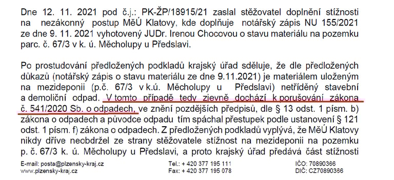 - zápis OŽP MÚ Klatovy z místního šetření na nelegální skládce Měcholupy