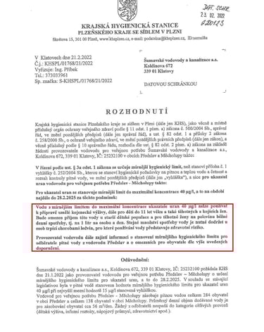 Jen drobný detail – legislativa něco takového vůbec neumožňuje. Voda, která nesplňuje hygienické limity, se jednoduše dodávat nesmí. Tečka. Ví to starosta Kreuzer, zastupitelé, ví to i krajská hygienická stanice. A přesto se v Předslavi zjevně našel jakýsi paralelní vesmír vodárenství, kde pravidla neplatí.