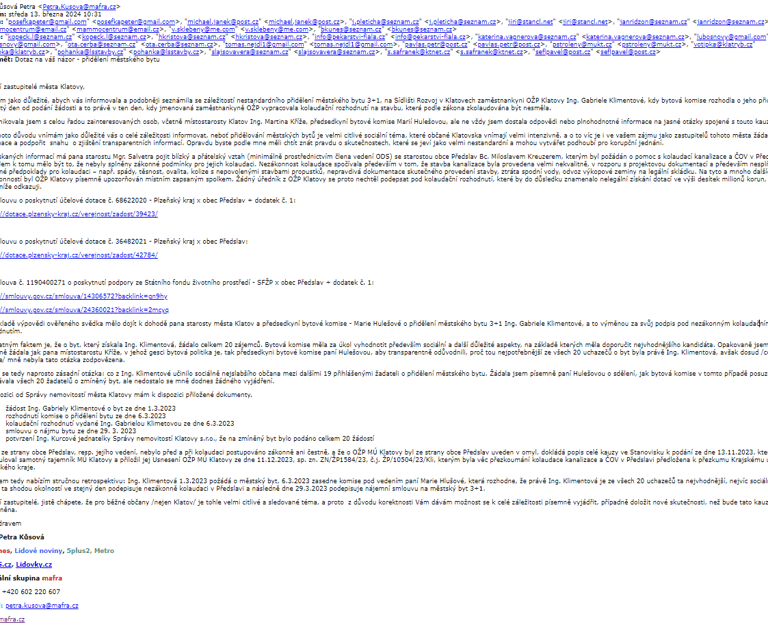 - potvrzení Ing. Kurcové jednatelky Správy nemovitostí Klatovy s.r.o., že na zmíněný byt bylo podáno celkem 20 žádostí