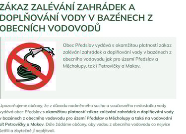 Nyní přišla další bolavá rána. Starosta obce Bc. Miloslav Kreuzer místním rozhlasem vyhlásil a na obecních webových stránkách uveřejnil zákaz zalévání a dopouštění bazénů z obecního vodovodu s platností i pro obecní části Předslav, Měcholupy, Petrovičky a Makov.