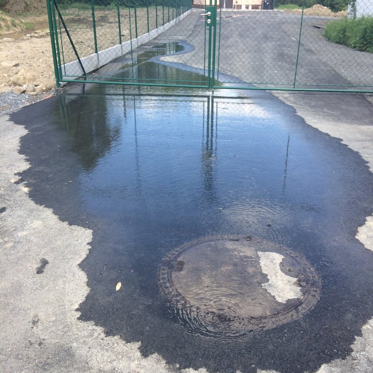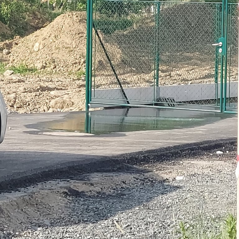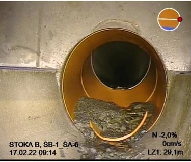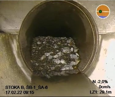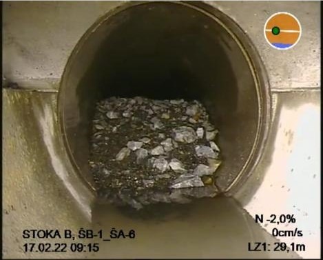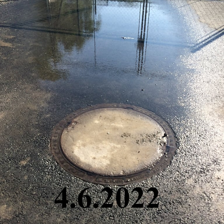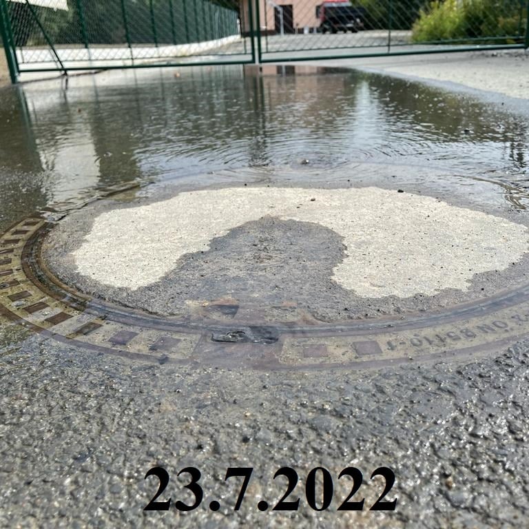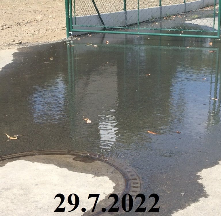 Nově budovaná kanalizace musí být absolutně nepropustná. Tato vlastnost musí být před kolaudací potvrzena provedením kamerových a tlakových zkoušek. Jak je patrné z přiložené fotodokumentace, je nově zbudovaná kanalizace zcela netěsná. Z poklopů kanalizace umístěných před čistírnou (nejnižší místo kanalizační stoky) vesele teče voda. Celý kanalizační řad je plný vody, která se tam stahuje z celé obce. Na nejnižším místě kanalizace pak z poklopu voda vytéká...