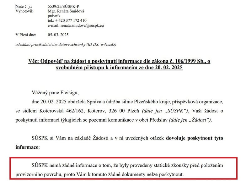 Jenže ouha – SÚS o žádných statických zkouškách nic neví. Viz vyjádření SÚS Plzeňského kraje. Prý jim nikdo žádné dokumenty nedal. Takže buď v Předslavi mají neviditelné statické zkoušky, nebo někdo trochu... fabuluje.