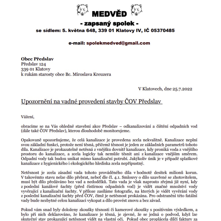NOVĚ ZJIŠTĚNÉ NEZÁKONNOSTI KOLAUDACE KANALIZACE V PŘEDSLAVI