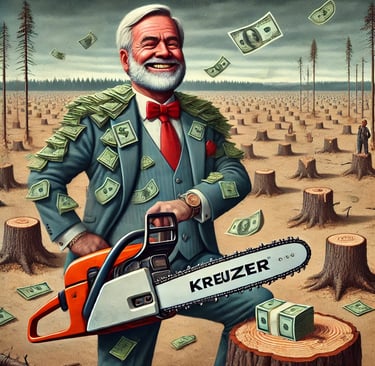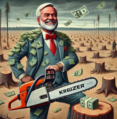 Takže, co říci závěrem? Zatímco jiní zástupci obcí staví parky, pečují o zeleň a chrání místní přírodu, náš Bc. Kreuzer má raději zvuk řvoucích pil a padajících kmenů (asi poslouchá Rolling Stones :-) ). Těžko říct, jestli má starosta v plánu pokračovat, ale jak ho známe, možná zase něco chystá, zatímco my budeme čelit holým kopcům. Vítejte tedy v naší krásné obci, kde příroda ustupuje před osobními zájmy a peníze mají vždycky navrch!